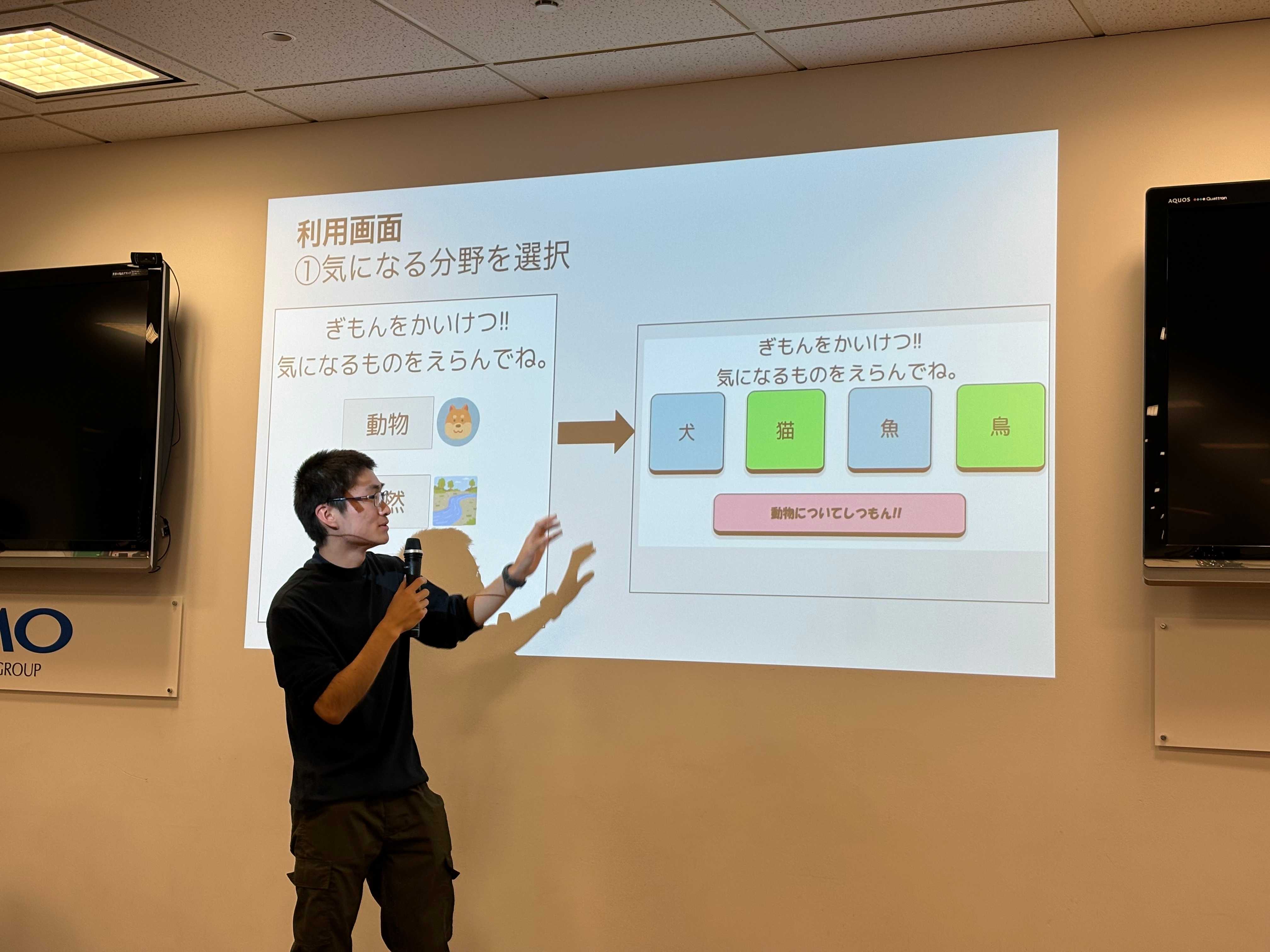 チーム E は、小学校 3〜6 年生の好奇心旺盛な小学生に向けて、気になる項目をクリックするだけで身近な疑問に AI がわかりやすく答えてくれるアプリケーションを作りました。気になる分野を選択していくだけで簡単に身近な疑問を解決することができます。